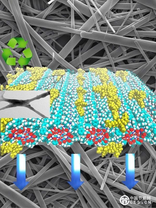 图中显示肽纳米管上聚合物分布的模拟图,以及纳米复合材料的电子显微影像