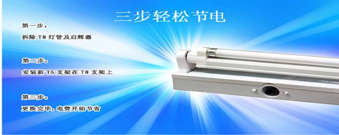 附注:T8转T5节能支架有标准型和带反光罩型,带反光罩型在原有基础上照度可提高20%以上;以上三种产品与普通超级节能灯技术参数、应用范围一样,分为28w、21w、14w替代原T8灯具40w、30w、20w。