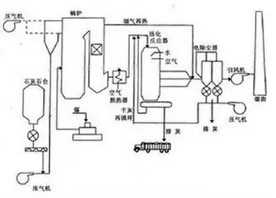 从锅炉出来的含有粉尘和SO2的烟气,从脱硫塔的底部经过文丘里管上升,进入塔内。生石灰在消化器内加水消化后,在消石灰仓储存。将一定量的消石灰粉和水在文丘里喉口上端加入,在脱硫塔内与烟气混合流动,并与烟气中的SO2反应,生成亚硫酸钙和硫酸钙。携带反应产物和煤灰的烟气冷却到稍高于露点以上的温度,进入后面的布袋除尘器。反应产物和煤灰被除尘器处理后,通过空气斜槽返回塔内,再次循环参与脱硫反应。在垃圾焚烧炉烟气净化中,在除尘器前加入活性炭末,通过多次循环,以达到脱除重金属、二噁英的效果,脱硫灰通过仓泵输灰至灰仓外排。由于消石灰、煤灰和反应产物多次在脱硫塔和除尘器之间循环,增加了反应时间,消石灰的作用得以充分发挥,用量减少,同时脱硫效率得以提高。