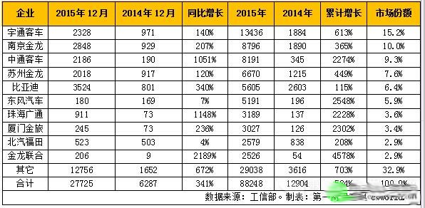 具体来看,2015年12月,纯电动客车产量最高的企业,是比亚迪(竟然不是宇通?!),它的当月产量达到3524辆,同比增长340%;;第二名是南京金龙,12月份的产量达到2848辆,同比上涨207%;第三名是宇通客车,12月生产纯电动客车2328辆,同比上升140%;第四名、第五名分别为中通客车(2186辆)和苏州金龙(2018辆),分别同比增长1051%和120%。