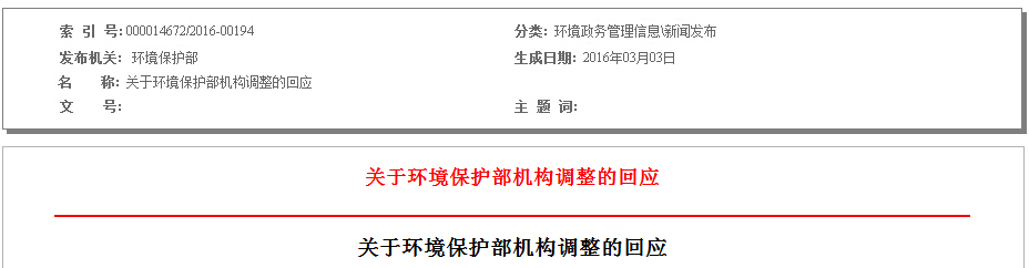环保部发布,关于环境保护部机构调整的回应,详情如下: