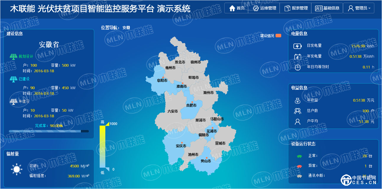 2016年3月,五部委联合发布了《关于实施光伏发电扶贫工作的意见》,意见明确了16个省471个县的重点实施范围,这表明光伏扶贫已获得国家层面的高度认可!而随着光伏精准扶贫项目农户数量的持续增多、建设分布范围的不断扩大,传统的监管模式已不能同时满足多方的个性化需求。“北京木联能软件股份有限公司”作为可再生能源整体方案领先提供商,以用户需求为中心,结合光伏扶贫项目的特点,率先自主研发推出了针对光伏扶贫项目的智能化监控服务平台(以下简称“平台”),形成了以政府、“运维企业”及农户的需求为核心的“三位一体”的智能化监控服务平台。