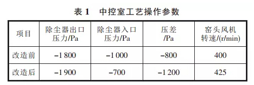 2014年7月23~24日,当地环保局环境监测站对窑头袋除尘器进行了监测,监测结果为23mg/m³(标态),满足排放标准。中控室工艺操作参数见表1。