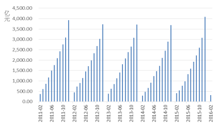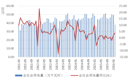 用电量方面,2015 年全国全社会用电量累计 55500 亿千瓦时,同比增长0.52%。2016 年 2 月实现全社会用电量 3311.52 亿千瓦时,同比增长 4.02%用电量增速有所回升。