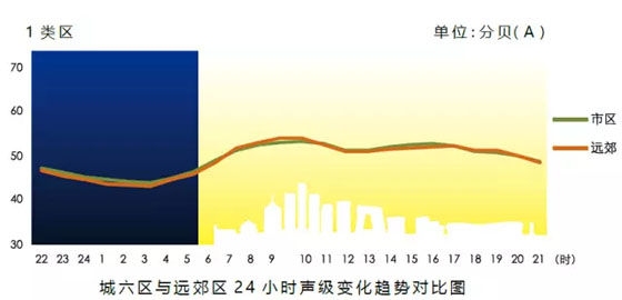 射对于居民住宅、医疗卫生、文化教育、科研设计、行政办公为主要功能的区域来说,环境噪声水平城六区与远郊区基本持平,并且各类功能区24小时噪声变化规律基本一致。