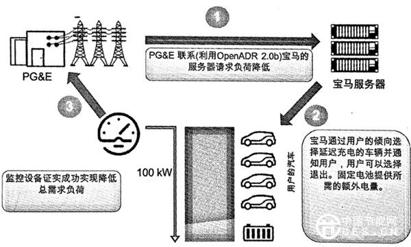 美国太平洋天然气电力公司(PG&E)与宝马公司选取了100辆的宝马i3进行了为期18个月的“需求响应”实验项目。所谓“需求响应”,主要的思路是“移峰填谷”,鼓励用户在用电谷时进行充电。具体的实验内容是,当PG&E面临较大用电压力、有降低负荷需求时,会向宝马公司发出通知,然后宝马公司会向这100辆选中的宝马i3用户发出停止充电请求,用户可根据意愿选择接受或拒绝。对于选择接受的用户,宝马公司会通过远程终止其充电进程,并给予相应的奖励。此外,该项目还利用宝马电动汽车拆卸下来的电池,作为静态储能装置,在非峰荷时段吸收、贮存可再生电力,并在需求增长的时段向电网提供这部分被事先贮存的电力。