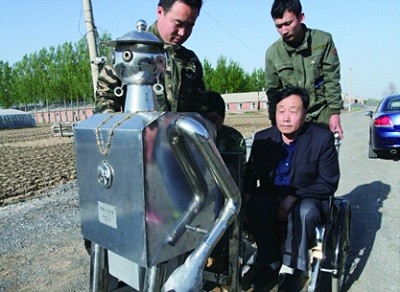 5月10日,记者来到海城市东四管理区东甘村,熊克斌正坐着代步机器人在村路上遛弯,机器人的外形是按照人体的外形仿制,机器人身后连接着钢制板车,上面还有两个座椅,离远看像是拉黄包车的车夫。熊克斌还给机器人取了名字,叫“熊熊”。