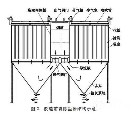 为了彻底解决袋除尘器滤袋袋底破损、运行阻力偏高等问题,需要从壳体结构、气路系统和清灰控制等三个方面对原来的袋除尘器进行改造。