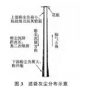 由于袋除尘器采用下进气方式,气流是从滤袋底部向上运动的,含有灰尘的烟气会不停地冲刷底部,时间一长就会造成滤袋袋底破损。另外,由于烟气从滤袋底部向上运动,滤袋的底部、中部和上部过滤速度会不一样,并且烟气中粉尘颗粒粗细有一定分布范围,在重力作用下会使大部分粗颗粒沉积在滤袋下部而细颗粒沉积在滤袋上部(见图3),从而造成滤袋下部粉尘负荷较大,再加上气流的不均匀,滤袋会产生晃动,造成滤袋间相互摩擦,从而造成滤袋袋底裙部磨损,见图1。