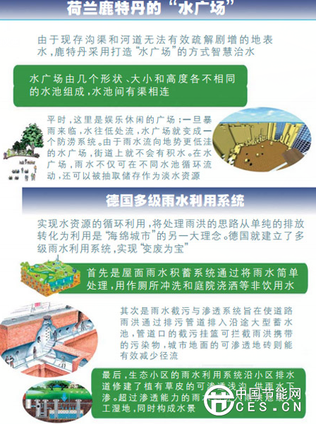实现水资源的循环利用,将处理雨洪的思路从单纯的排放转化为利用是“海绵城市”的另一大理念。德国就建立了多级雨水利用系统,实现“变废为宝”。首先, 屋面雨水积蓄系统通过将雨水简单处理,用作厕所冲洗和庭院浇洒等非饮用水。其二是雨水截污与渗透系统,道路雨洪通过排污管道排入沿途大型蓄水池,管道口的 截污挂篮可拦截雨洪携带的污染物;城市地面的可渗透地砖则能有效减少径流。最后是生态小区的雨水利用系统,小区沿排水道修建了植有草皮的可渗透浅沟,供雨 水下渗。超过渗透能力的雨水则进入雨洪池或人工湿地,同时构成水景。