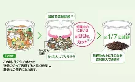 另一大好处就是能大大减小生活垃圾,把生活垃圾扔进去,只需要100分钟,垃圾就会减少到原来的七分之一,并且这款垃圾处理器可以追加投入,也就是说,上一次风干的垃圾处理完毕后无需倒出,就可以继续处理新的垃圾。