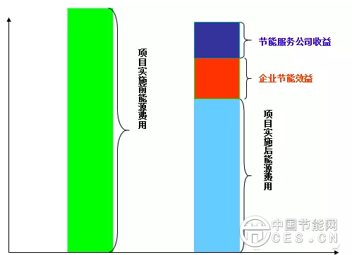 举个栗子,我(节能服务公司)帮你做一个节能项目,可能涉及到更换设备以及设备的运行管理要花500W,但是不需要你投资,我先帮你做,做好之后你要把接下来三年节省的能源的一半都给我,上个图说明一下: