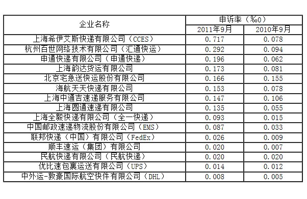 主要快递企业申诉率2011年9月与2010年9月比较统计表