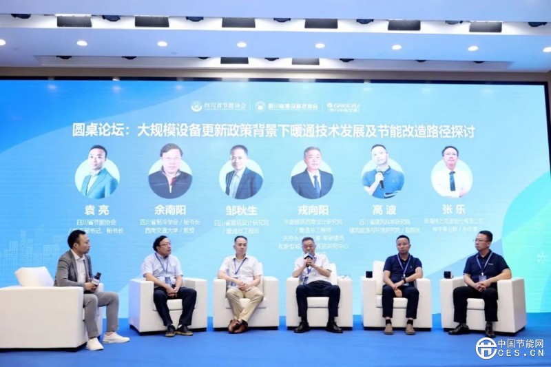 由四川省节能协会党支部书记/秘书长袁亮主持的圆桌论坛环节,邀请了中国建筑西南设计研究院有限公司暖通总工程师/天府永兴实验室-零碳建筑和新型城乡能源系统研究中心执行主任戎向阳、四川省建筑设计研究院有限公司暖通总工程师邹秋生、四川省制冷学会秘书长/西南交通大学教授余南阳、四川省建筑科学研究院有限公司建筑能源与环境研究院副院长高波、珠海格力电器股份有限公司楼宇事业群总经理张乐,共同围绕《大规模设备更新政策背景下暖通技术更新及改造》进行交流对话。