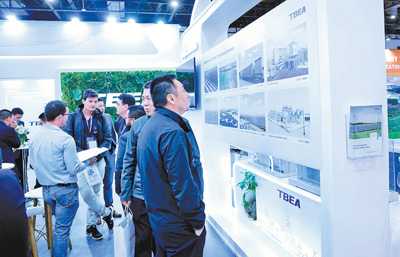 在中国企业特变电工公司展台,参观者在了解该公司项目案例。