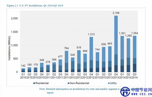根据美国光伏产业协会与GTMResearch联合发布的一份分析报告称,2014年第三季度,美国太阳能光伏发电项目安装总量达到1,354MW,较去年同期上涨逾40%。目前,该国光伏系统装机总量约为17,500MW,足够向美国大约280万户普通家庭供应电力。