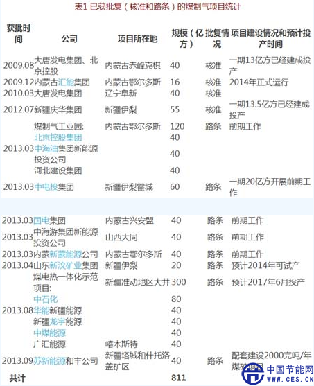 截至2013年,国家发改委共核准了4个煤制气示范项目,合计产能达151亿立方米/年。分别是大唐发电辽宁阜新40亿立方米/年项目、大唐发电内蒙古赤峰克旗40亿立方米/年项目、内蒙汇能鄂尔多斯16亿立方米/年项目和新疆庆华集团伊犁55亿立方米/年项目。其中,大唐克旗项目一期13亿立方米/年和新疆庆华伊犁项目一期13.5亿立方米/年工程均已建成投产。