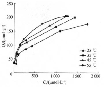 25、35、45、55 ℃下螯合树脂对Ca2+的离子交换等温线如图 4 所示。