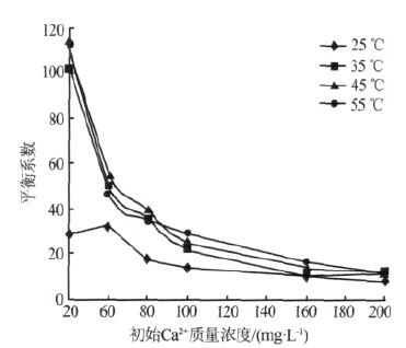 由图 6 可知,在同一Ca2+初始浓度下随着温度升高,平衡系数增大,特别是25~35 ℃,平衡系数大幅增加,表明随着反应温度的增加,螯合树脂对Ca2+的选择性提高,有利于废水中Ca2+的选择性去除。
