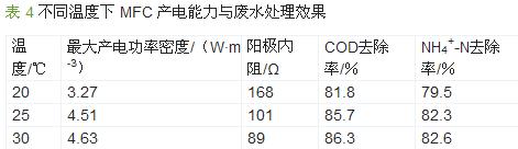 不同温度下MFC的产电能力与废水处理效果如表4所示。