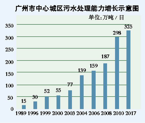 据广州市净水公司介绍,从1989年第一座污水处理厂建成运行后的14年里,广州市中心城区污水处理厂的建设速度一直不温不火,2003年,污水处理能力只有77万吨/日。但是到了2008年,短短5年时间,污水处理能力大幅增长至187万吨/日。再往后只用了2年,广州亚运前夕,污水处理能力已经增长至298万吨/日,使中心城区以往又黑又臭的水环境有了很大改观。