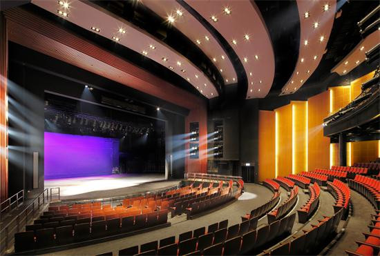 室内外设计渗入不少中国元素: 大楼外立面的木窗栅遮阳板和灰白石墙的配搭演译苏州园林的精髓、弧形主入口以仿照中国绳结的设计为装饰,套入现代建筑却不落俗套。整个设计过程与业界沟通 无间,场内设施详细考虑各类型表演的需要,特别是粤剧的舞台要求,因此设计比一般剧院更为讲究,例如更衣室和排练室的出入口位置因应服饰改至二点八米高, 方便表演者出入。而剧院可容纳六百人,座位排列呈弧形,前座座位数量较多,让观众易于观赏表演者的神态,拉近两者间的距离。