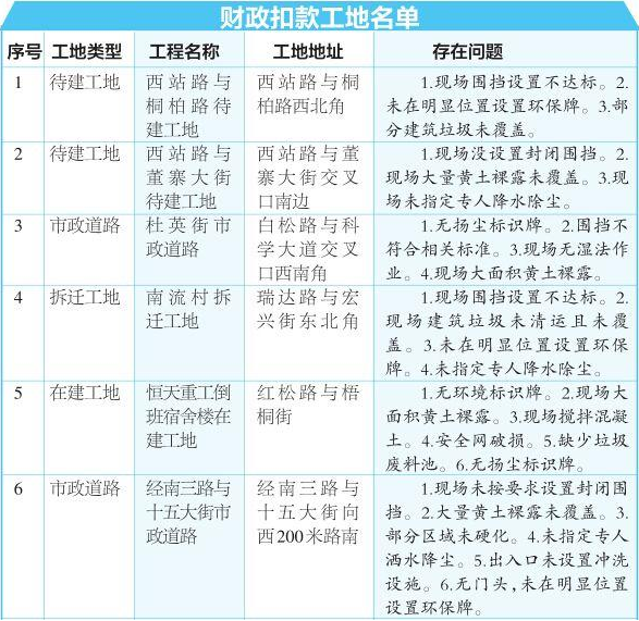 通报称,西站路与桐柏路西北角的待建工地因存在现场围挡设置不达标、未在明显位置设置环保牌、部分建筑垃圾未覆盖等问题,前日对中原区政府实施财政扣款10万元。该处归西站路街道办管。