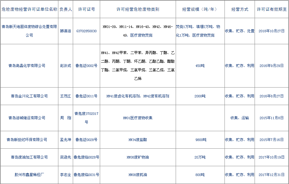 截止到2014年底,全市取得危险废物经营许可证的单位共有15家,其中,综合性处置单位1家,医疗废物收集运输单位1家,废矿物油处置利用单位3家,废有机溶剂处置利用单位3家,废乳化液和包装桶处置利用单位1家,氰化尾渣处置单位1家,含镍废催化剂处置利用单位1家,废矿物油收集单位1家,锌灰处置利用单位1家,废酸处置利用单位2家(危险废物经营许可证单位名单见表4)。