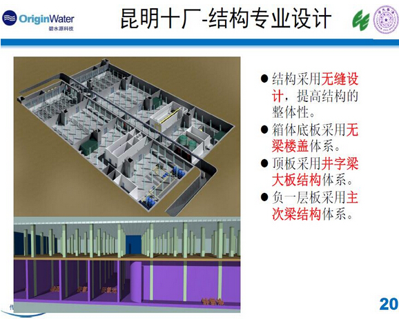 我谈一谈这个厂的结构专业设计,这是施工的情况,基础是筏板基础。我对这个工程的结构了解了很多。整个池子是地下的,无缝的,顶层是景观层。每一个结构设计方式都是不一样的,这是景观层做的实验照片。这是两回路,70%的供电就可以了,地上是100%,都是二级负荷,但是变压器容量达到100%。因为地下污水处理厂对消防和应急照明要求比较高,我们配了500KVA备用发电机组。会有应急照明,在特殊的,特别是消防控制中心,发电机房等场合要做应急照明,要求30分钟连续供电的时间。自控方面要求也是很严的。除臭也是地下式污水处理厂非常重要的一环。