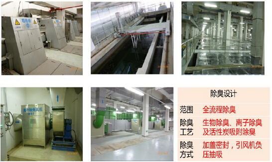 除臭这个环节是被动式的,只要做在地下,必须做好除臭,不做好除臭,这个厂是不能正常运营的,地上污水处理厂没有这个问题,所以除臭是要考虑的,不同的区域,采用不同的除臭的方法。比如说预处理,地上污水处理厂污泥这块不会除臭,地下这块也要除臭,用生物除臭的方法,空间也要做活性炭吸附。除臭换气要求2小时一次,这是除臭的照片。