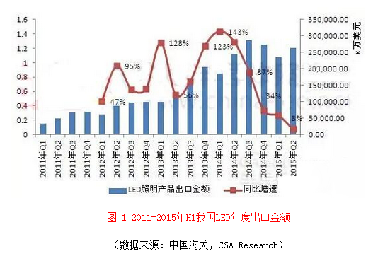 中国作为全球照明产品的制造基地,LED照明产品出口形势从高速增长阶段进入到中高速增长区间。CSA Research对海关出口数据的分析表明,2015年上半年我国LED照明产品出口总额约50亿美元,较2014年上半年同比增速为16%。