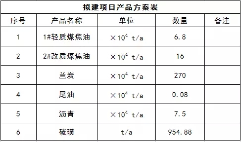 产品方案:本项目以煤为原料,通过对煤的低温干馏分级提质出兰炭、荒煤气、煤焦油等,再利用荒煤气制氢对煤焦油进行加氢改质。项目最终产品主要为兰炭和改质煤焦油产品。