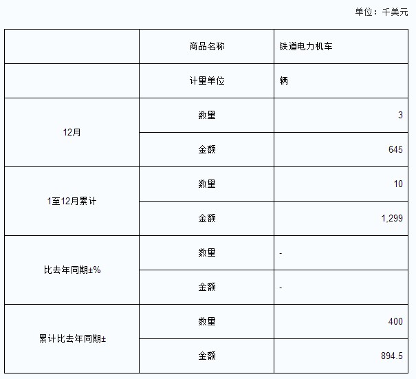 2013年1-12月中国进口铁道电力机车商品数量及增速同比