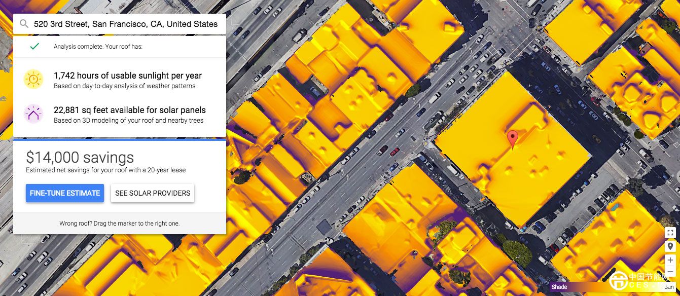 谷歌“屋顶阳光普照”项目的评估素材会用到和谷歌地图相同分辨率的航空照片来绘制地球,为你的屋顶3D建模。会使用计算机深度学习,可以扣除覆盖在屋顶上的阴影面积。借助谷歌地图快速更新的特质,这部分数据可以来自不同时段。地图上可以看到长出或移走的树木造成遮挡变化,这部分因素也会被加入算法。详细的电费节约情况需要户主提供以往的家庭用电参考,如果这项数据空缺,系统就会默认根据所在地区的平均用电量做估测。