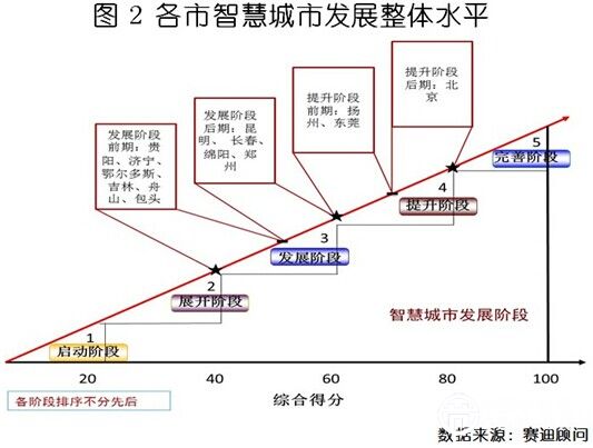 综合考虑智慧城市建设特点与建设程度,物联网、云计算、移动互联等新兴产业发展与应用程度等,智慧城市建设可划分为五个阶段,即启动阶段、展开阶段、发展阶段、提升阶段、完善阶段。城市信息化建设的启动阶段,主要指在部分领域的零星建设,难以构成体系;在展开阶段,城市信息化建设开始得以体系化推进,但建设和应用水平相对较低;在发展阶段,城市信息化建设呈体系化,但各领域之间的建设程度极不平衡;提升阶段的城市信息化建设与体系已经比较全面,相关产业和应用都得到规模化的提升;而完善阶段的智慧城市建设是城市信息化水平的极大飞跃,信息化应用创新活跃,应用程度全面深入,达到了信息化手段支撑下的城市繁荣。