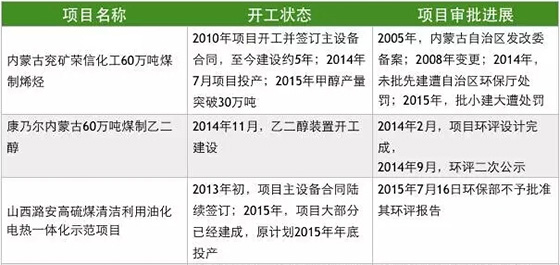 涉嫌未批先建:涉嫌未获得任何环评批复就开工建设的,甚至因未批先建受到过环保部门查处,或被环保部门否决了环评的。本次统计出6个项目,包括煤制油、煤制烯烃、煤制乙二醇等行业;分布在内蒙古、新疆和山西。