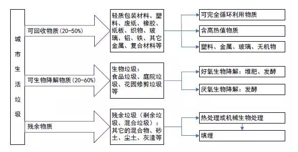 2 废物治理在德国,垃圾处理顺序为:源头削减-回收利用-焚烧回收能源-最终填埋处理,即在源头上就对垃圾进行控制是重中之重。德国拥有世界上最完善的生活垃圾分类收集系统。可回收物质约占生活垃圾产生总量的20-50%,主要包括轻质包装材料、塑料、废纸、橡胶、纸板、织物、玻璃、铝、铁、其它金属、复合材料等,在分类收集后,直接送入相关的工厂进行循环利用。可生物降解物质占生活垃圾产生总量的20-60%,主要包括食品垃圾、庭院垃圾、花园修剪垃圾等生物质垃圾,通过生物降解方式进行堆肥处理。残余物质是除上述垃圾种类之外的生活垃圾,也被称为剩余垃圾或混合垃圾,主要包括其它的垃圾混合物、砂土、尘土、灰渣等,通过热处理(焚烧)或机械生物处理方式进行处理,最后进行填埋。德国目前采取的生活垃圾处理方式除了回收可循环利用的垃圾(包括堆肥)外,主要采取热处理(焚烧)、机械和生物处理、填埋等几种生活垃圾处理方式。