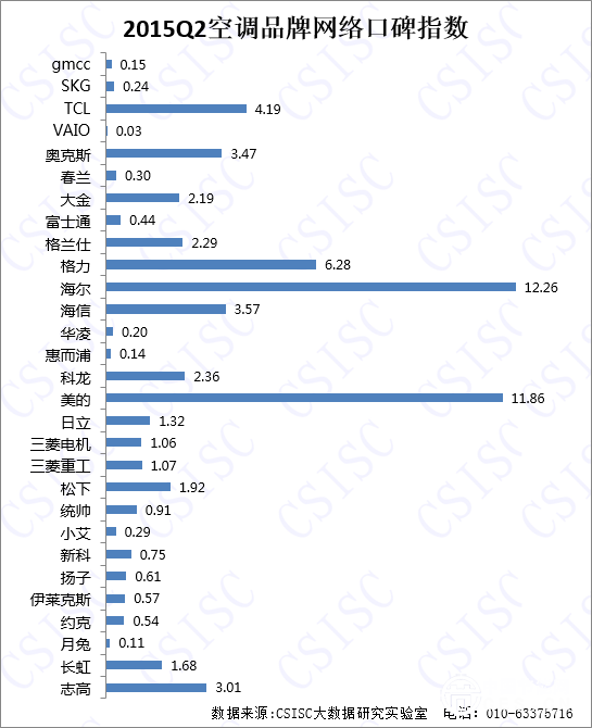中国统计信息服务中心联合新华网、中国质量新闻网今日发布2015二季度《中国空调品牌口碑研究报告》(以下简称《报告》)。《报告》以市场表现比较活跃的品牌作为监测研究对象,共监测采集71个品牌数据,从中筛选出29个各方面比较突出的空调品牌作为研究对象而产生的。分别是:gmcc、SKG、TCL、VAIO、奥克斯、春兰、大金、富士通、格兰仕、格力、海尔、海信、华凌、惠而浦、科龙、美的、日立、三菱电机、三菱重工、松下、统帅、小艾、新科、扬子、伊莱克斯、约克、月兔、长虹、志高(文中品牌按字母排序)。