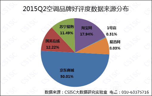 2015年第二季度空调行业采集主要品牌产品好评度的数据主要来自于淘宝网、京东商城、国美在线、苏宁易购、易迅网、1号店六大电商平台。其中,好评度主要分布在京东商城,占总体的50.01%;1号店分布最少,仅0.31%。