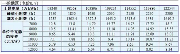 项目的投资效益有主要关注以下几个要素:场址的资源水平、电价、上网电量、投资水平等。为了方便读者查询。本文提供收益查询表格见下表。使用表格前,只需要确定当地资源的峰值小时数,确认投资水平,即可估算查询出项目融资前税前的内部收益率的大致范围。