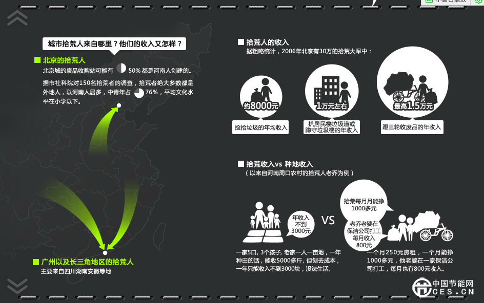 我们见惯了超市琳琅满目的饮料,很少见到空瓶子堆积如山,事实上,城市里每人每天制造大约1.21公斤的垃圾。我们总是一股脑地将垃圾扔到垃圾箱中,这样就万事大吉了吗?这些垃圾去了哪里?处理它们花了多少钱?它们对环境污染多大?在我们侃侃而谈垃圾围城的时候,垃圾分类的最初一环——拾荒人,寄居在城市的角落,几乎被忽视了。是的,他们以此谋生,却无意中成为城市垃圾分类的关键一环…
