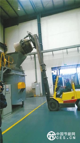 工作人员将餐厨垃圾投入生化发酵机中。