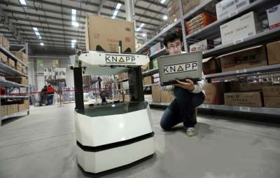 “双11”期间将在天津仓调动自主研发的多台智能机器人,拣选准确率可以达到99.99%。加上启用语音拣选系统,开放WMS云子母仓系统及智能仓储中心同步作业,提高拣选效率与准确性,解决“双11”期间扑面而来的海量订单,我们更有信心。”张特特说。