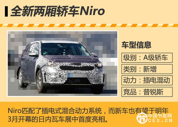 在新能源车型方面起亚还将推出全新紧凑级两厢轿车Niro,这款具有跨界车元素的全新产品在动力总成中将搭载一款排量为1.6L的自然吸气发动机,并且匹配了插电式混合动力系统,新车也有望于明年3月开幕的日内瓦车展中首度亮相。起亚全新Niro在外观方面采用了跨界车的设计元素,新车是基于2013年在法兰克福车展上发布的Niro概念车为蓝本打造,而就设计思路而言,该车借鉴了起亚秀尔与狮跑的外形风格,从而将两者结合,最终以全新平台打造这款插电式混合动力跨界车。