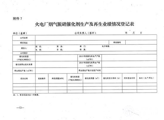 报送内容:火电厂烟气脱硝催化剂生产及再生业绩情况,按附件7填报。