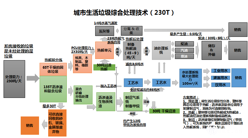 生活垃圾首先进行分选,砖头玻璃金属等进入可回收系统,其他物质干湿分离,其中干质物质(塑料、橡胶、纺织物等)制成RDF(垃圾衍生燃料),进入热解炉制成热解油,热解油深加工处理成符合国标的柴油进行销售。湿质物质进行发酵制取沼气,所产生的沼气用于给制取RDF提供能源,沼渣进入热解炉热解,渗滤液处理成中水后可以浇灌道路绿植。