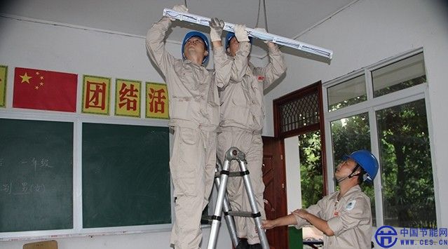 27日上午,国家电网四川电力自贡共产党员服务队的5名队员,冒雨来到大安区大山铺镇的邓萍小学,为该校免费安装价值1200元的日光灯,受到师生欢迎。据悉,服务队于2012年6月投入5万元为该校建成了留守儿童之家,配备了必要的设施。今年即将开校之际, 5名队员了解到学校的日光灯管老化无法照明,主动联系,带来灯管和工具,花了半天时间,安装好了所有教室的灯管,确保开校时能够使用。图为安装时的情景。