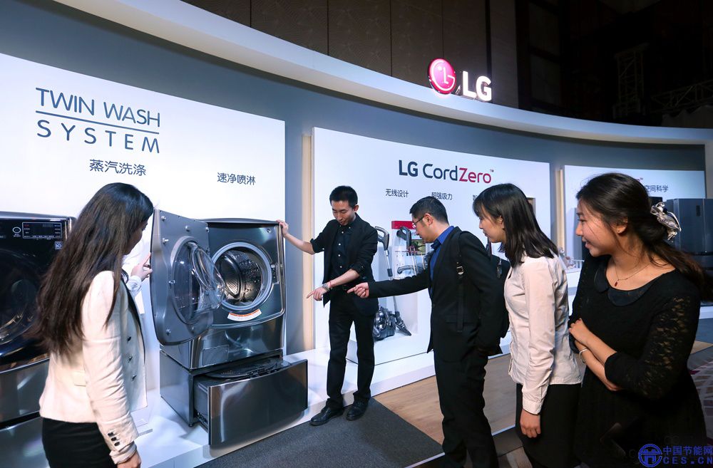在LG展区,我们可以看到双门中门冰箱以及双筒洗衣机的光芒。