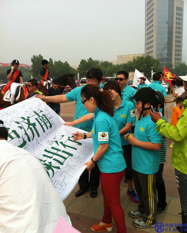 爱马人士和市民在“绿色济南 低碳出行”的旗帜上签名