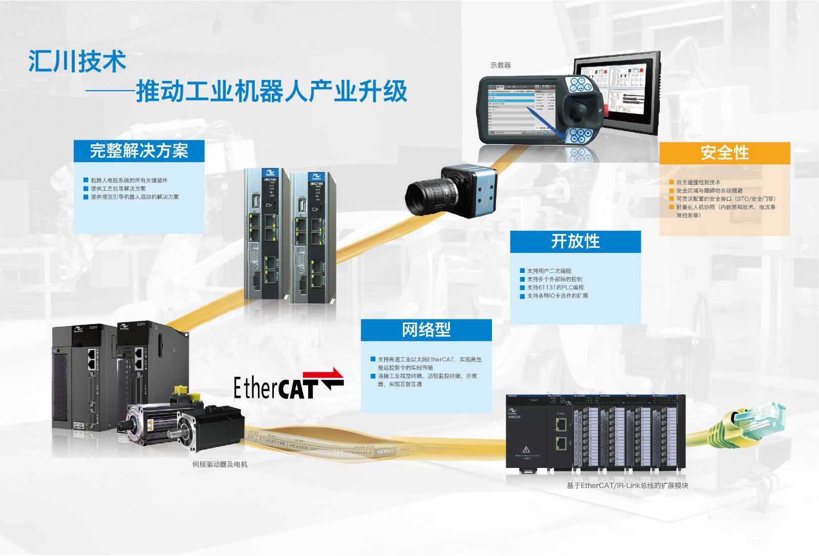 秉承着对高技术指标及高安全规格的一贯追求,汇川技术致力于提供真正意义上高度安全且全面适用的机器人核心部件及综合解决方案。现已推出高性能、工业以太网接口的IMC100系列工业机器人控制器和伺服产品,服务于工业机器人整机制造商,同时为客户提供工艺和应用方案的定制化,积极推动工业机器人产业升级。
